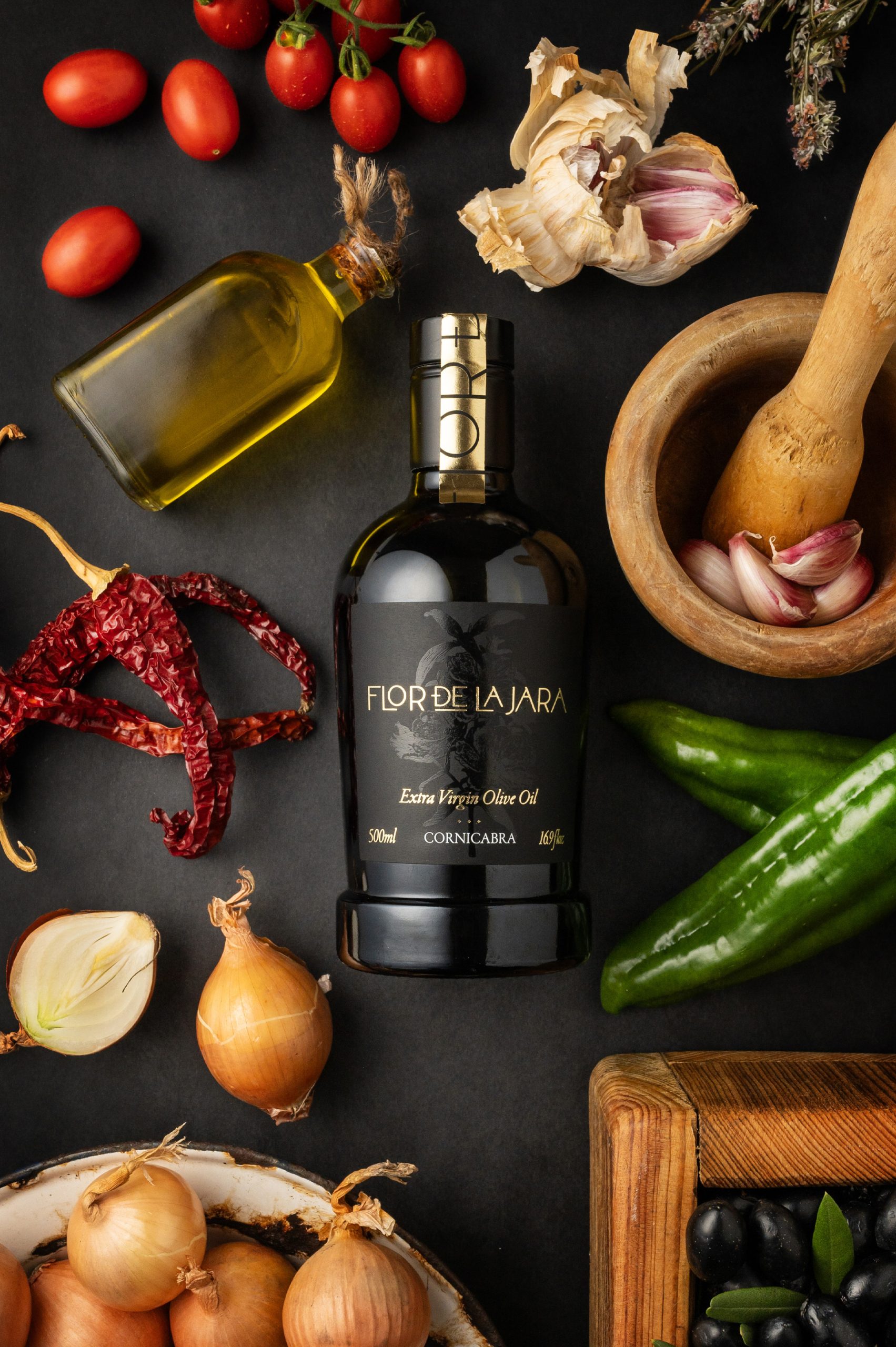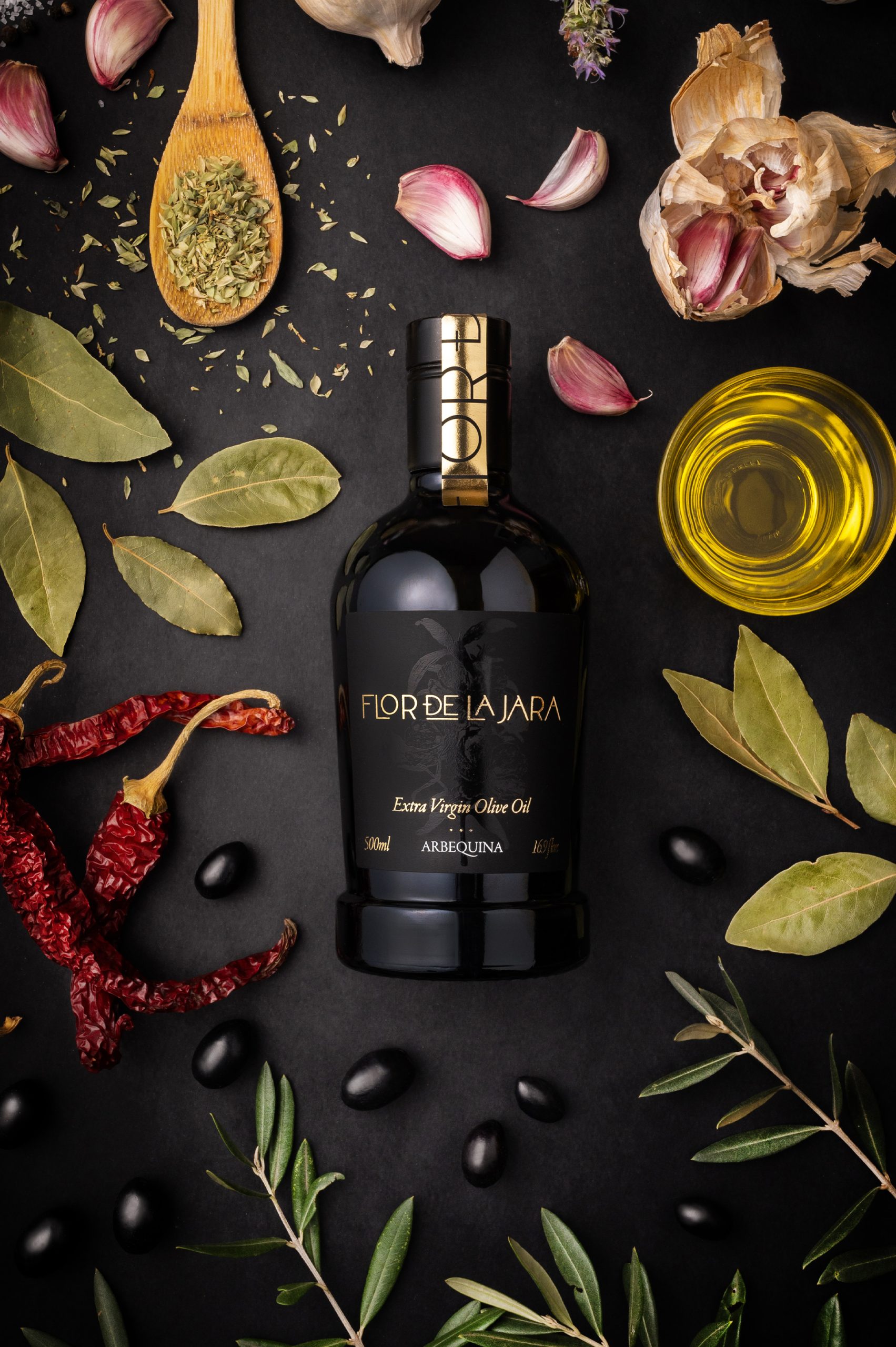 El aceite de oliva virgen extra premium de la familia se elabora con métodos tradicionales en su finca familiar en la región de «La Jara», en la provincia de Toledo, España. Las aceitunas se recolectan a mano, aprovechando el clima mediterráneo y los suelos fértiles para crear un sabor excepcional.